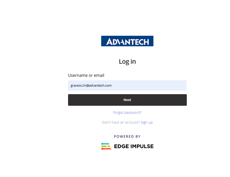 2.研华Edge Impulse登录页面,用户在此输入用户名或公司邮箱地址,点击"下一步"进行身份验证。其他选项包括重置密码或创建新账户。