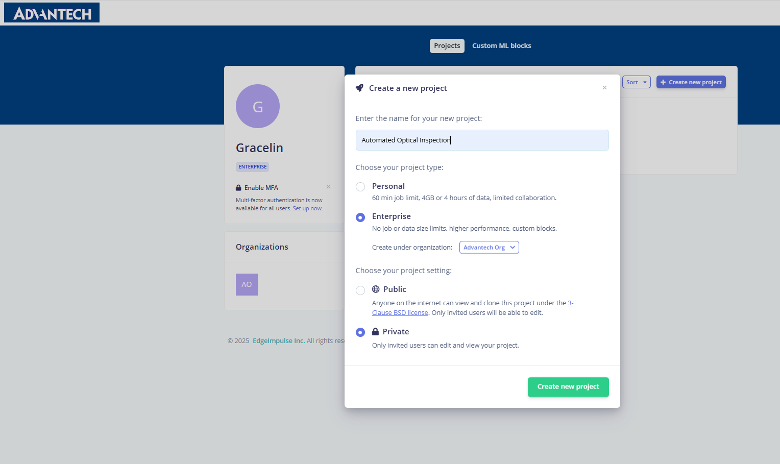 3.在Edge Impulse平台创建新项目时,请输入项目名称"自动化光学检测",选择企业类型,并设置为公开或私有模式,最后点击"创建新项目"。