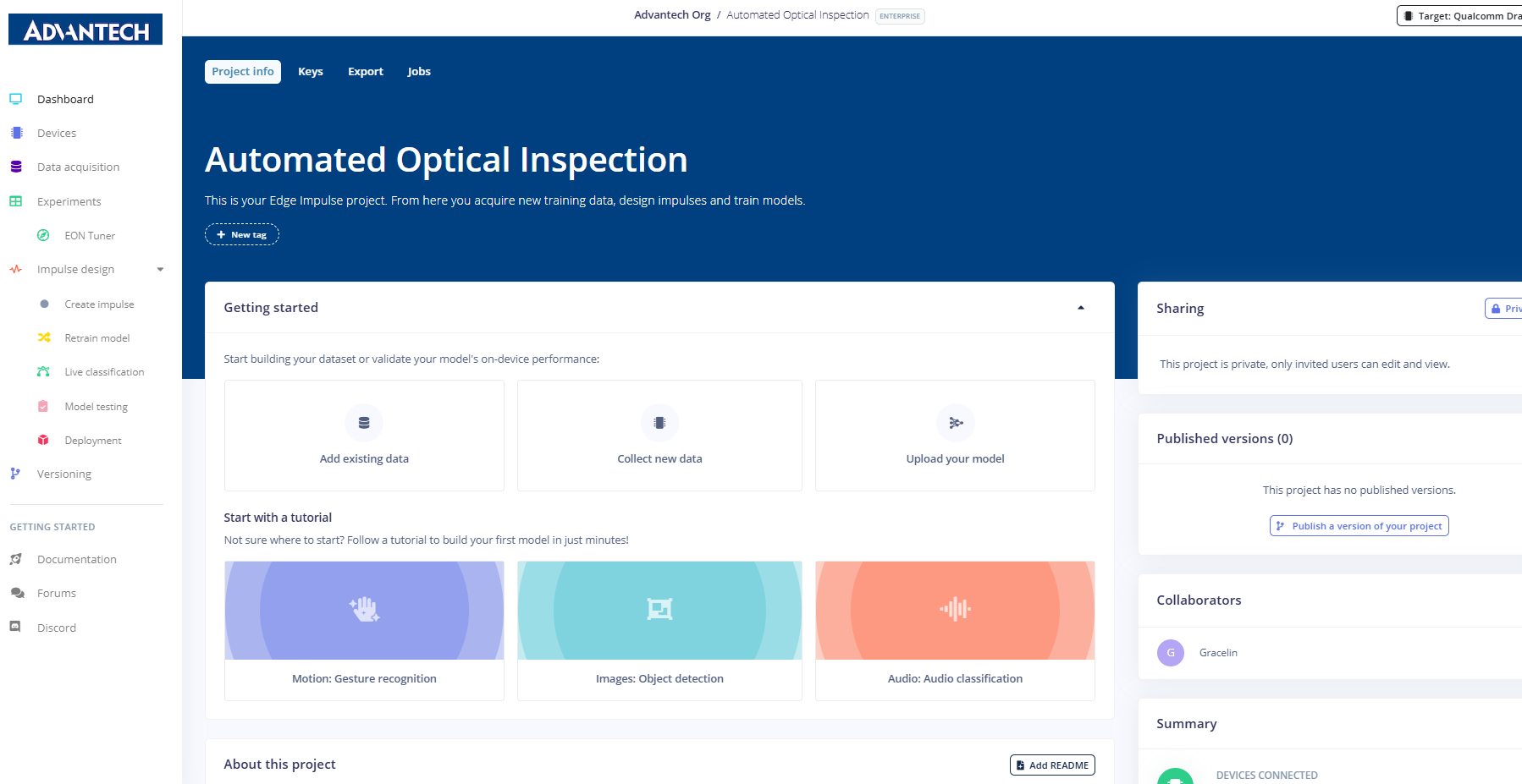 4.Edge Impulse平台中"自动光学检测"项目的首页,用户可在该页面添加现有数据、采集新数据或上传模型,并通过教程快速构建模型。