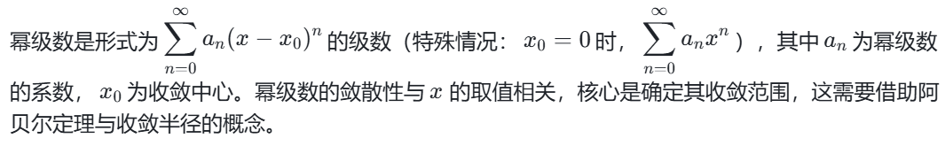 无穷级数是复变函数的基础之一,本质是无穷多项的数列相加求和的模型,其研究的重点在于如何判断一个级数的敛散性,即一个级数在写到无穷多项后,他们的和是否会越来越逼近一个具体的数,称为收敛;或者是不断振荡变化没有一个确定的值,称为发散。