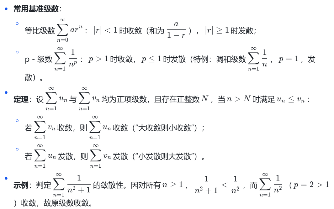 注意:这里面最重要的性质就是必要性,他是后续判断级数敛散性的第一步,如果区域无穷时,项值连趋近于0这个必要性都不满足,那么该级数必定发散。至于其他的性质有所印象即可,要用的时候自己推导思考一下很快能得出结论。