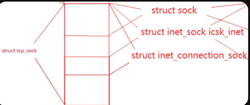 我们再回过来看 struct socket,其中有一个结构体指针 struct sock sk*,这个指针可以指向 tcp_sock 中最底层的 struct sock 结构体,然后可以通过类型转换,最终读取到整个 tcp_sock 结构体!也就是说,这个指针指向了 tcp_sock 结构体!
