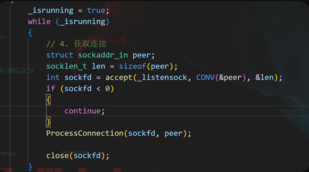 🌿 这里我们将 TcpServer.cpp 的 accept 代码注释掉