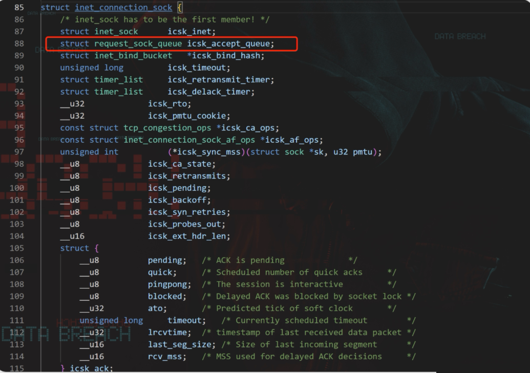 🛜 这是 TCP 套接字,其中包含了慢启动算法阈值* ,拥塞窗口大小 ,关联进程... 一系列 TCP 协议中的对应字段!这个 tcp_sock 就是三次握手时候建立的结构体!其中的第一个成员 struct inet_connection_sock 是复制连接属性的! 这里就包含连接的相关信息。全连接队列就在这个结构体中!