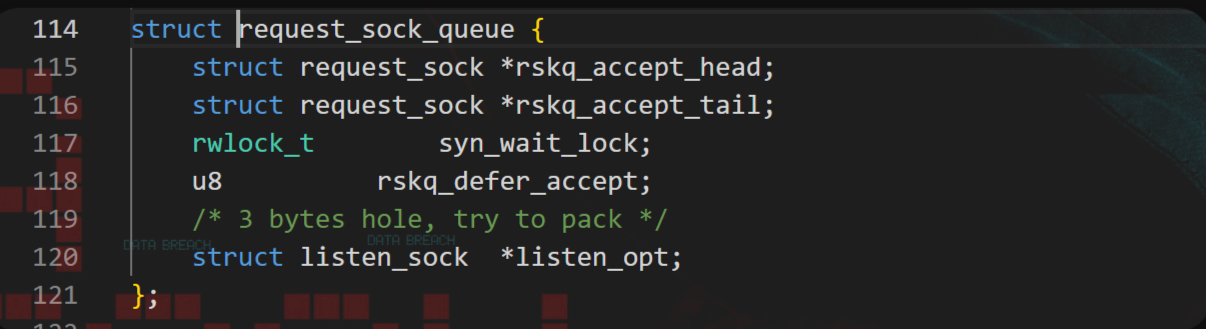 - 半连接队列(syn queue): 存储已发送 SYN 的连接,但尚未完成三次握手的连接 。每当收到 SYN 请求,服务器将这个连接放入半连接队列,直到三次握手完成或超时失败。(用来保存处于 SYN_SENT 和 SYN_RECV 状态的请求)