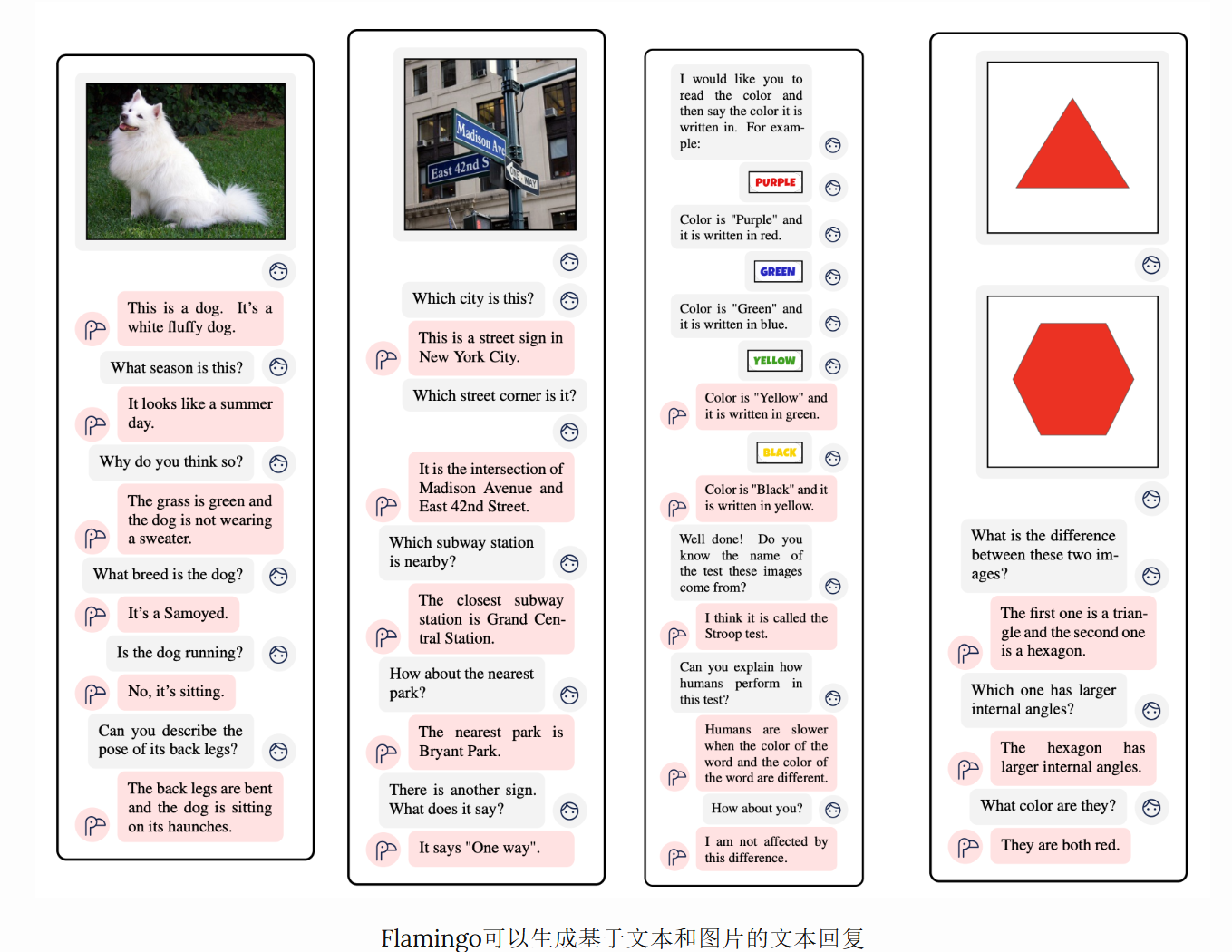与CLIP不同,Flamingo可以生成文本回复。从简化的角度看,Flamingo是CLIP+一个语言模型,增加了技术,使语言模型能够根据视觉和文本输入生成文本符号。