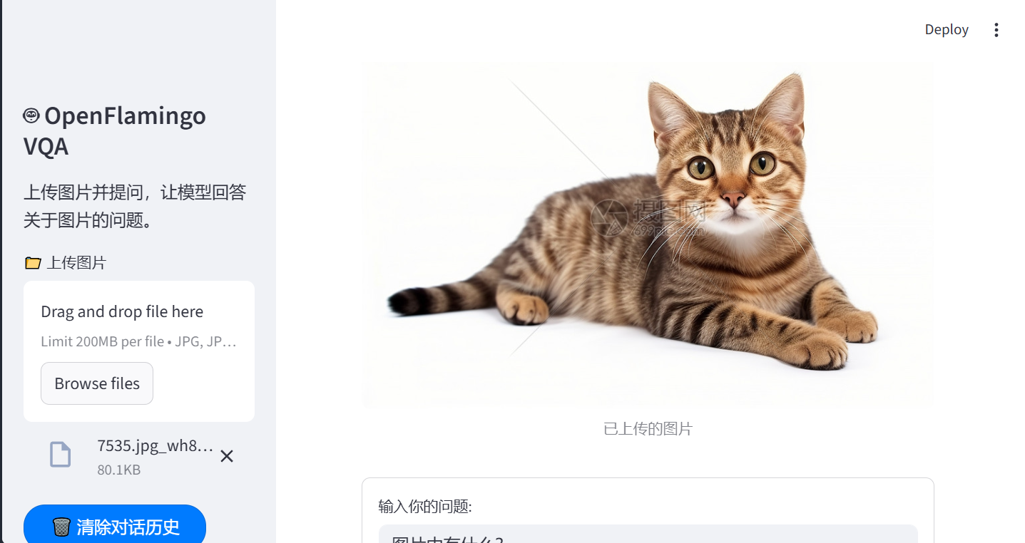 user_input = st.text_input("输入你的问题:", placeholder="例如: 图片中有什么? 猫是什么颜色?")