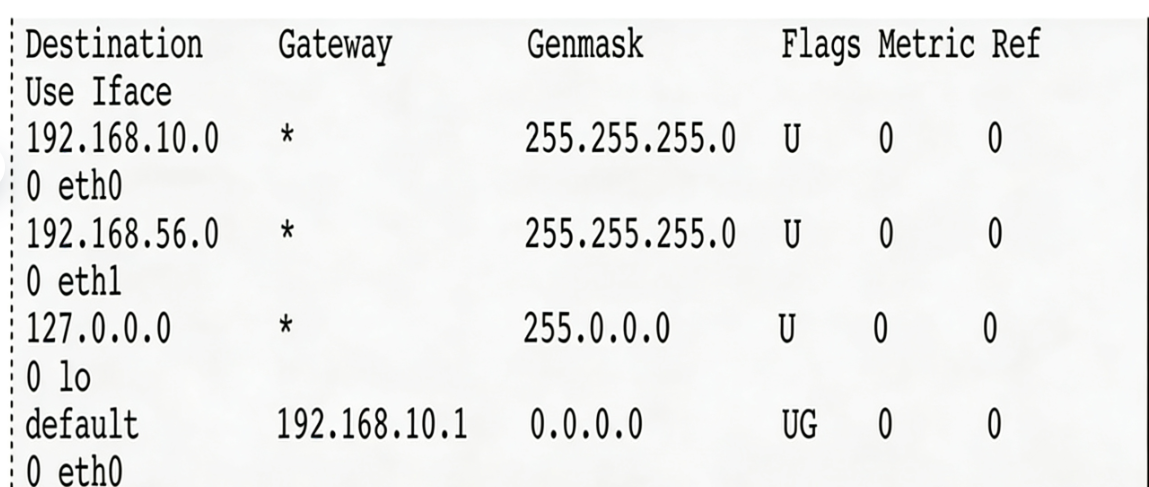 • 再跟第⼆行的子网掩码做与运算得到192.168.56.0,正是第⼆行的目的网络地址,因此从eth1接⼝发 送出去;