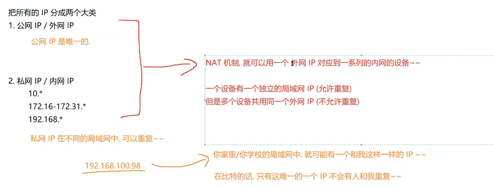 因为公网 IP 数量有限,不够每个设备分,所以用 NAT(网络地址转换)让一个公网 IP 对应多个内网设备: