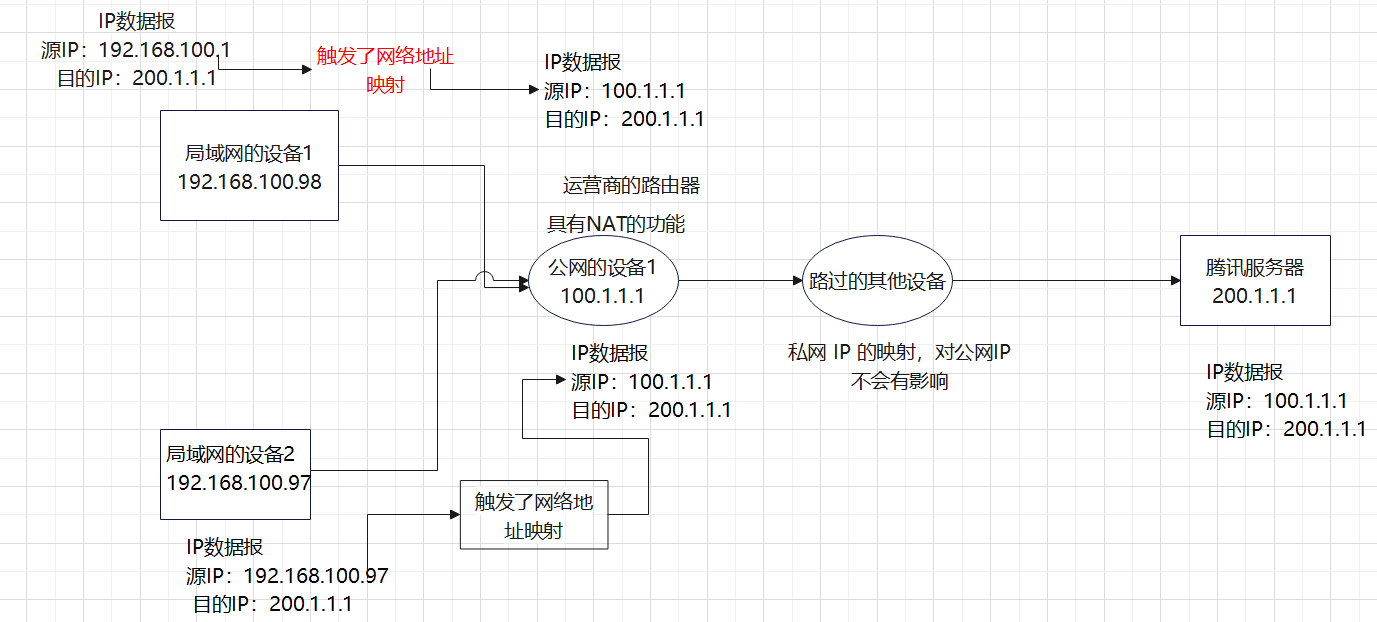私网的IP在私网中只有一个 ,但是不同的设别可能他自己的操作系统分配的端口号一样 ,访问的公网IP是一样的 ,但是端口号不一样,所以说即使他们访问的同一个应用程序的服务器,服务器发送的响应也能很快的识别对应的私网设备