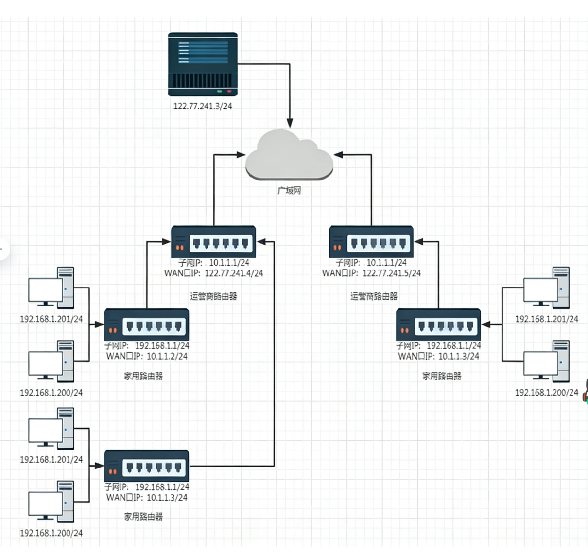 • 每⼀个家用路由器,其实又作为运营商路由器的子网中的⼀个节点.这样的运营商路由器可能会有很 多级,最外层的运营商路由器,WAN⼝IP就是⼀个公⽹IP了.