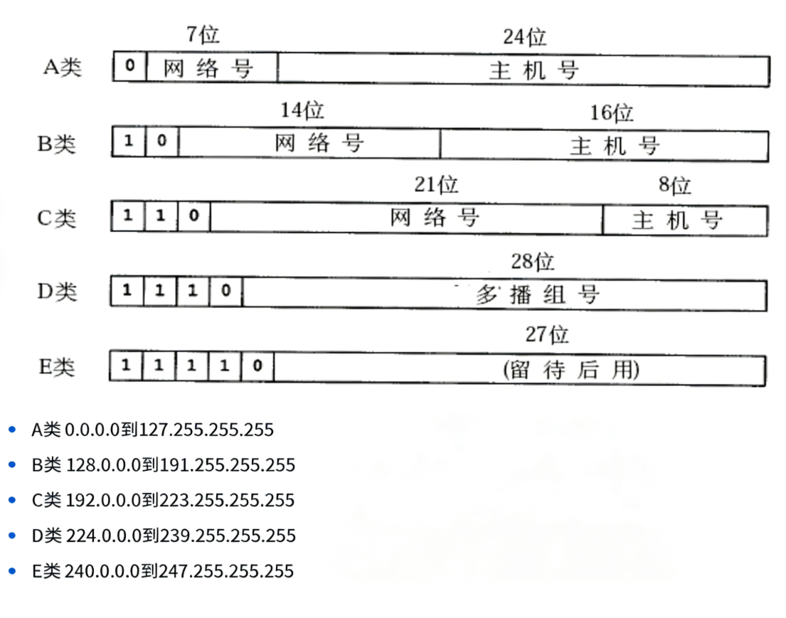 过去曾经提出⼀种划分⽹络号和主机号的方案,把所有IP地址分为五类,如下图所⽰。