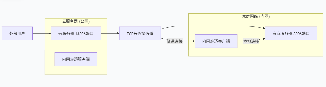 云服务器转发请求 :云服务器收到 13306 端口的请求后,通过之前和家里服务器建立的TCP 长连接,把请求数据转发给家里的服务器。