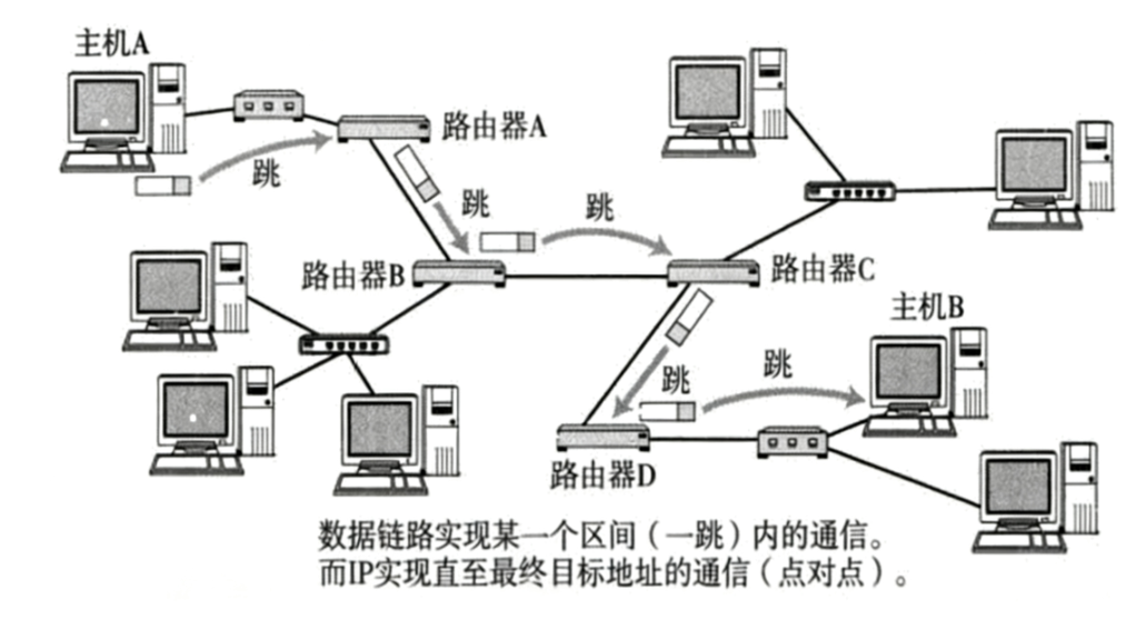 所谓"⼀跳"就是数据链路层中的⼀个区间.具体在以太⽹中指从源MAC地址到⽬的MAC地址之间的帧 传输区间