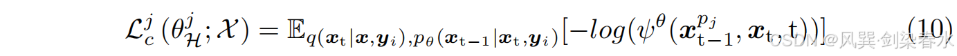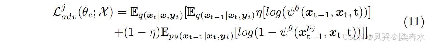 除了去噪生成器外,本文还采用了一个共享的时间依赖性判别网络 ψ ψ ψ ,以确保它们之间的协同训练。 ψ ψ ψ 通过评估 x t − 1 x_{t−1} xt−1 是否是 x t x_t xt 的合理去噪版本来区分 x t − 1 x_{t−1} xt−1 和 x t x_t xt,使用的是判别损失 L c j \mathcal L^j_c Lcj。