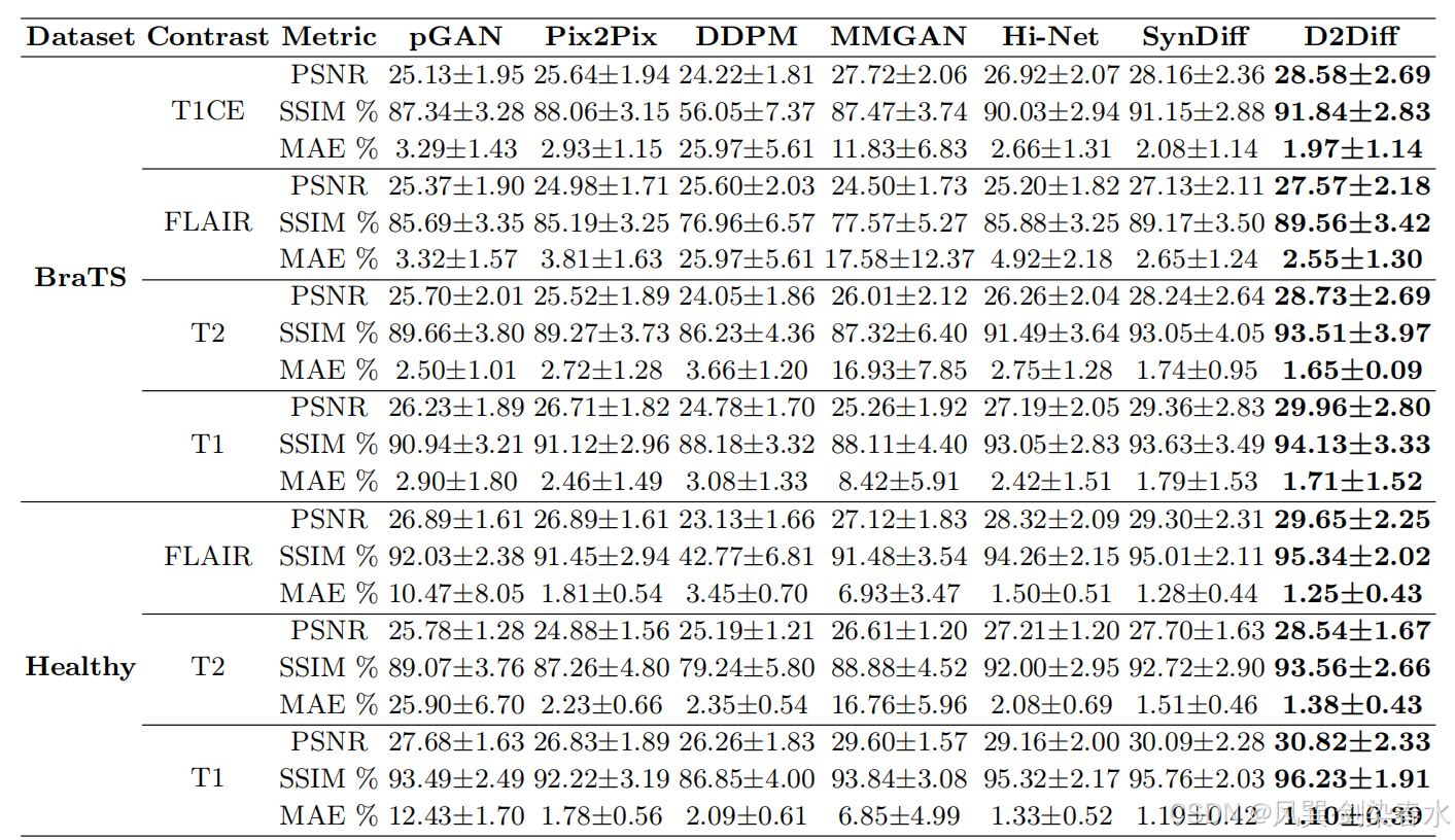Table 1 | :健康数据集与 BraTS 数据集在不同合成序列图像下的性能比较(均值±标准差)