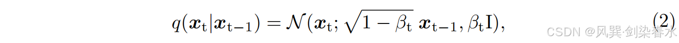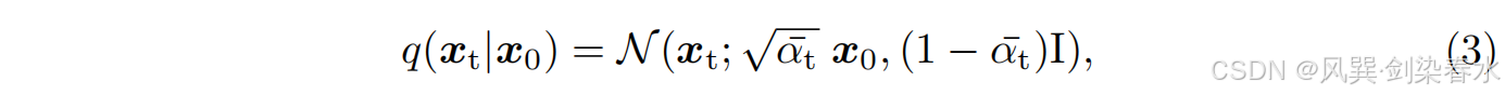 其中 β t β_t βt 是用于向数据添加噪声的噪声方差表, N \mathcal N N 是高斯分布, I I I 是单位协方差矩阵。利用扩散过程的马尔可夫特性,可以直接获得 x t x_t xt 的边缘分布,如下所示: