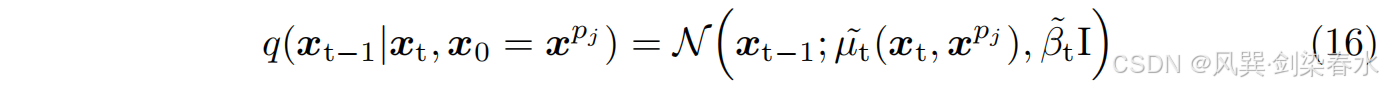 在推理过程中,从时间步 T T T 开始,以随机高斯噪声 x t x_t xt 为起点,并通过 T T T 个采样步骤进行迭代优化。在每一步中,利用前向过程的马尔可夫特性,按如下方式推导出第 t − 1 t−1 t−1 个样本: