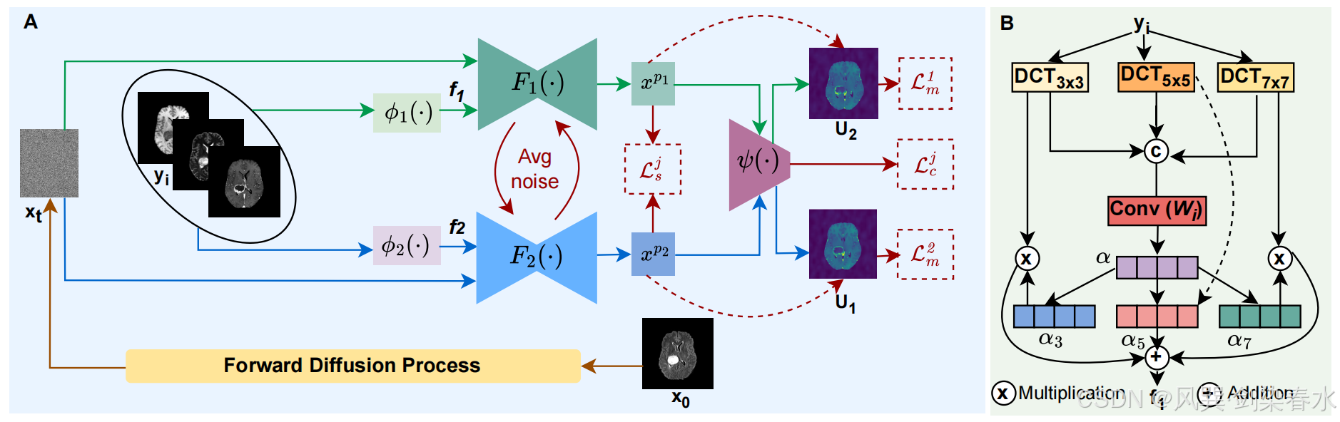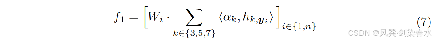 其中 W i W_i Wi 是一个可学习的卷积变换层, α k α_k αk 表示如 图1(B) 所示的自适应特征组合过程,其中使用基于 softmax 的注意力机制( α α α)来分配动态权重( α 3 α_3 α3 , α 5 α_5 α5 , α 7 α_7 α7),以决定每个频率特征在最终表示中的影响程度。这些特征的加权和形成了融合表示 f 1 f_1 f1,用于引导第一个去噪网络。