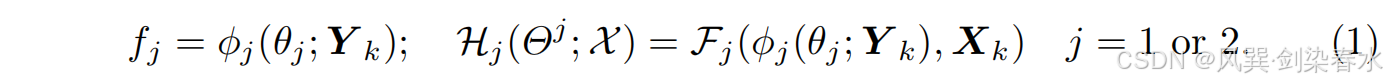 设 X = ( X k , Y k ) k = 1 m \mathcal X =(X_k,Y_k)^m_{k=1} X=(Xk,Yk)k=1m为一组 m m m 对配准的 MRI 图像,其中 x k x_k xk 表示待合成的目标对比度, y k = { y k , i } i = 1 n y_k = \{y_{k,i}\}^n_{i=1} yk={yk,i}i=1n 表示作为生成目标的条件输入的 n n n 个源图像。(多对一图像生成)将去噪网络表示为 H j ; j ∈ { 1 , 2 } H_j;j ∈ \{1,2\} Hj;j∈{1,2},其中编码器-解码器 F j F_j Fj 和双域特征提取 ϕ j ϕ_j ϕj 是其功能分解: