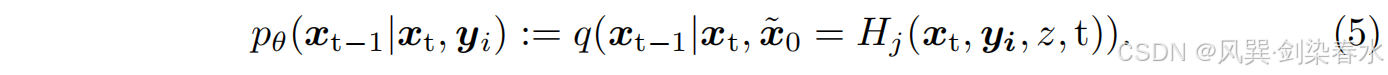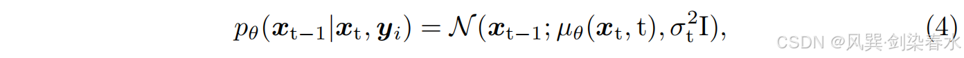 其中 α t : = 1 − β t α_t := 1 − β_t αt:=1−βt 和 α ˉ t : = ∏ s = 1 t α s \bar α_t := \prod^ t_{s=1} α_s αˉt:=∏s=1tαs 。逆向扩散过程估计后验分布 p θ ( x t − 1 ∣ x t , y i ) p_θ(x_{t−1}|x_t,y_i) pθ(xt−1∣xt,yi),以生成由条件 y i y_i yi 引导的真实 x 0 x_0 x0:
