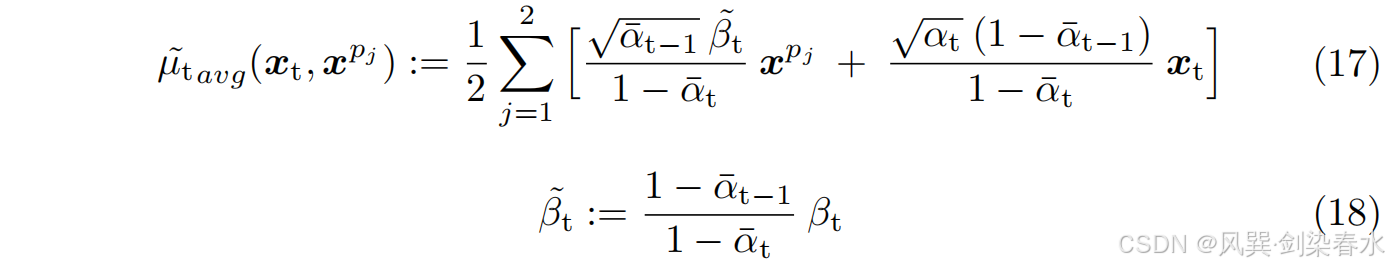 为确保两个去噪网络之间相互学习,采用 公式3 和 公式4 推导出两个网络间的平均噪声预测均值,如下所示: