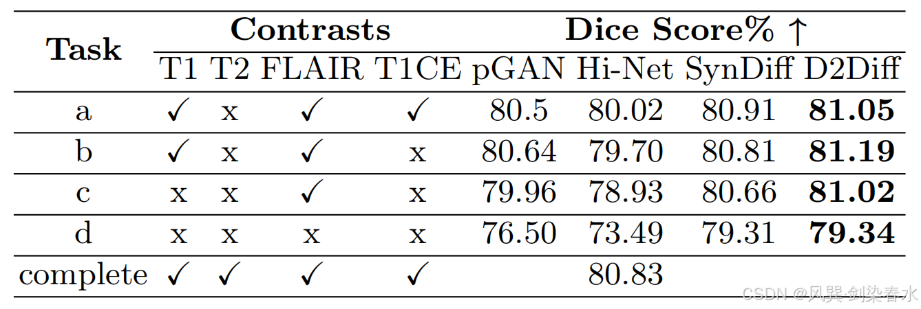 为了评估合成图像的诊断等效性,使用 BraTS 数据集进行了肿瘤分割。在所有四种序列中,使用 MONAI U-Net 进行训练,以预测肿瘤掩模,其训练-测试划分与合成任务相同。
