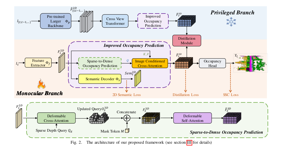 - 解决方案:特权分支蒸馏,设计了一个特权分支(教师模型),这个分支被赋予了特权,它的输入更丰富,接收多帧时序图像作为输入,利用时间信息来减少遮挡区域的不确定性。并且,它使用了更大的预训练图像主干网络。不是为了直接使用这个又大又慢的"特权分支",而是通过知识蒸馏,将其学到的关于时空和语义的"丰富知识",迁移到最终使用的、轻量级的单帧单目模型(学生模型)中。最终部署的模型依然保持高效、紧凑,适合实际应用,但却拥有了从大模型和时空中学到的强大推理能力。