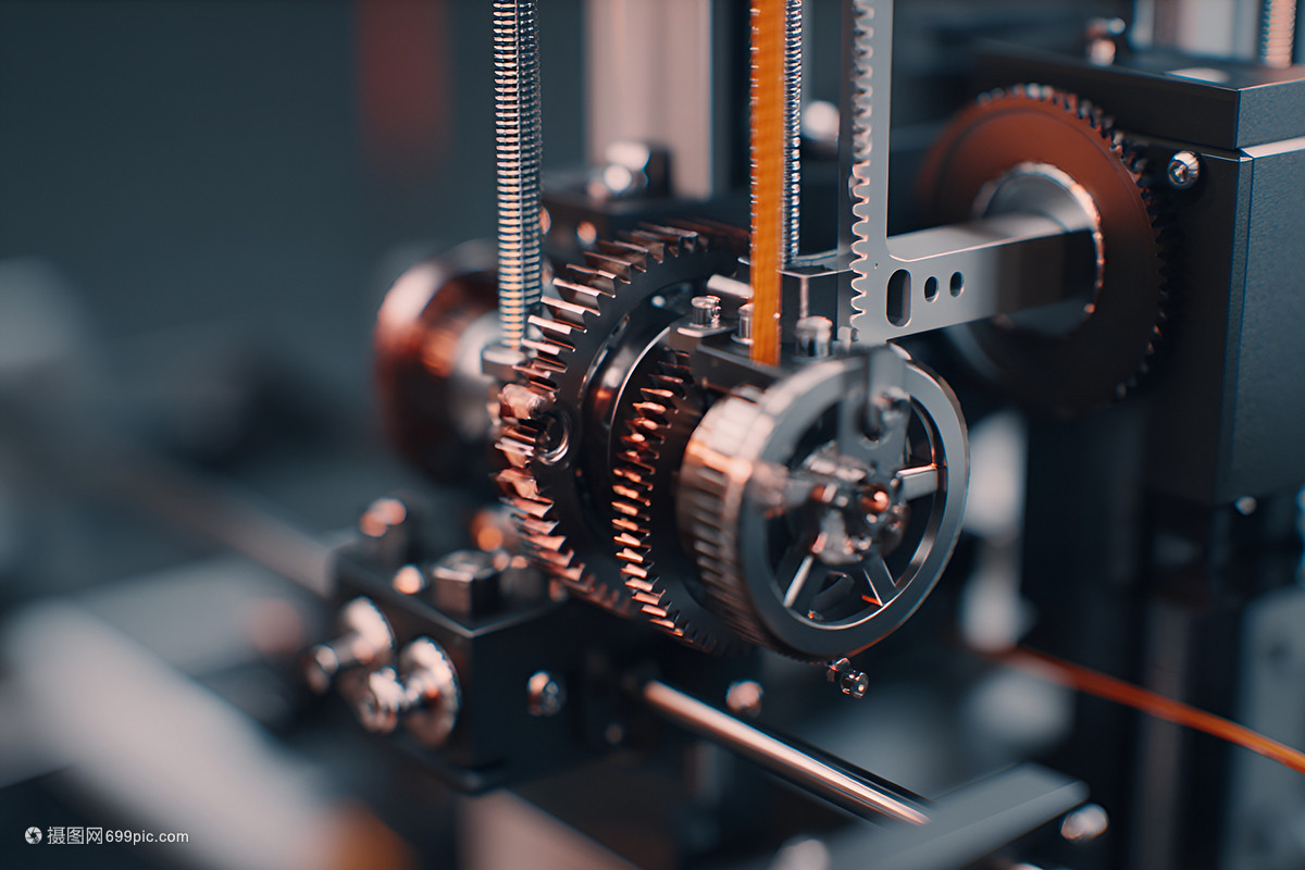 图片核心元素表达:这张图片的主题是:机械臂指尖的金属微光:细节特写下的动态运作、3D打印机内部齿轮,图片中包含的元素有:机械臂运作 金属齿轮 动态特写