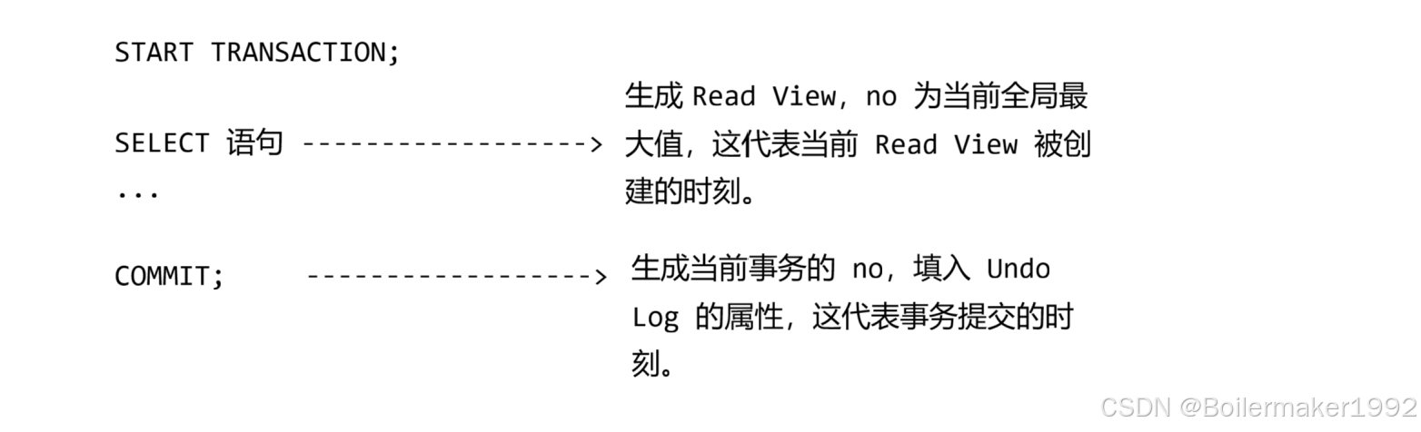 可能听起来有点乱,但是只要记住这个 no 就是用来记录事务提交与 Read View 被创建之间的相对时间先后的就好,这与刚刚的第一点是呼应的。如果还是没理解可以看下面的图片: