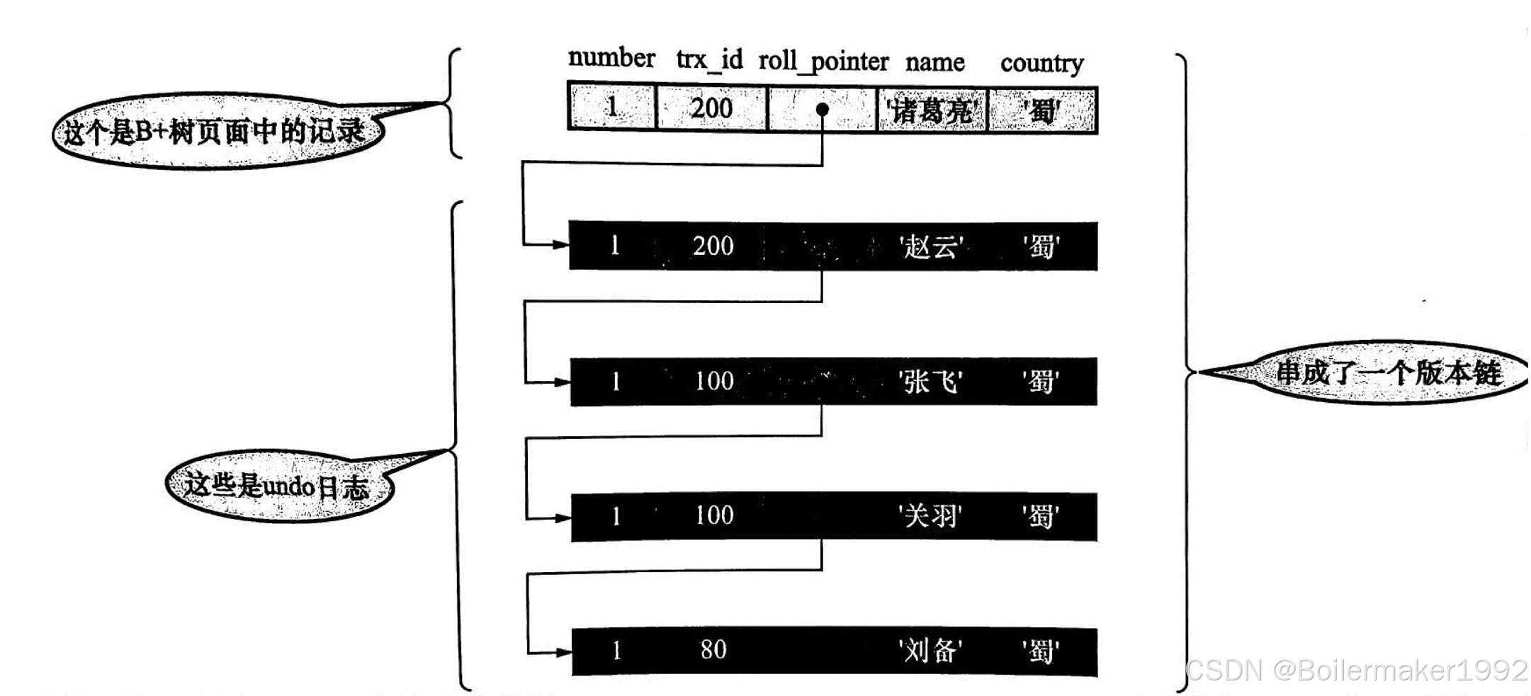 InnoDB 中当前数据页上存储的是最新版本的数据,旧版本的数据通过 Undo Log 构建。因此版本链直观来看是类似下面的数据结构: