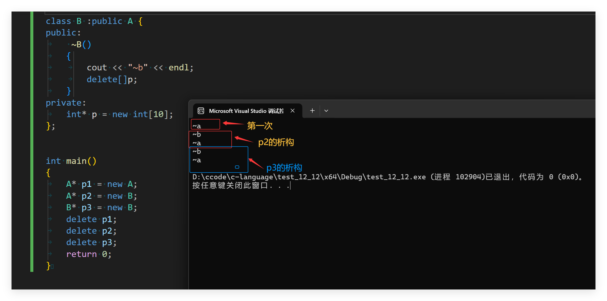 这是三个变量,其中两个都是以基类作为指针的,但是我们发现如果加了virtual是可以正确调用到B的析构函数。