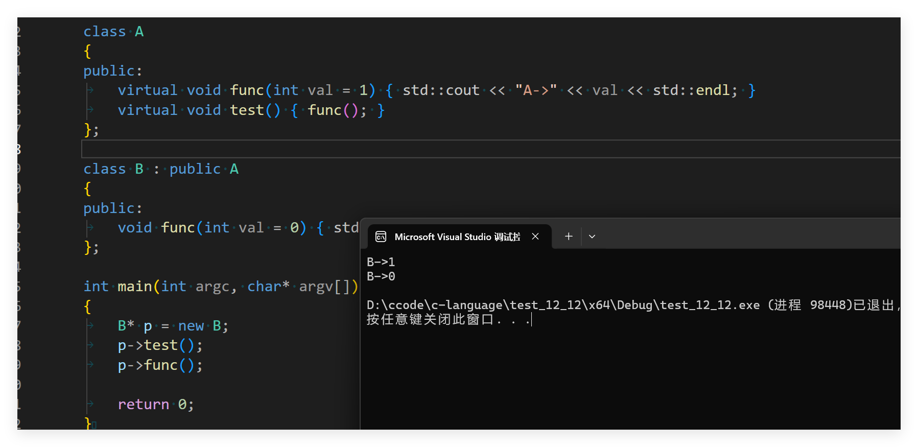 关键点:默认参数是在编译时根据调用者的静态类型决定的,而不是运行时根据对象的实际类型决定的。test() 在类A中,所以调用 func() 时使用的是类A的默认参数 val = 1。