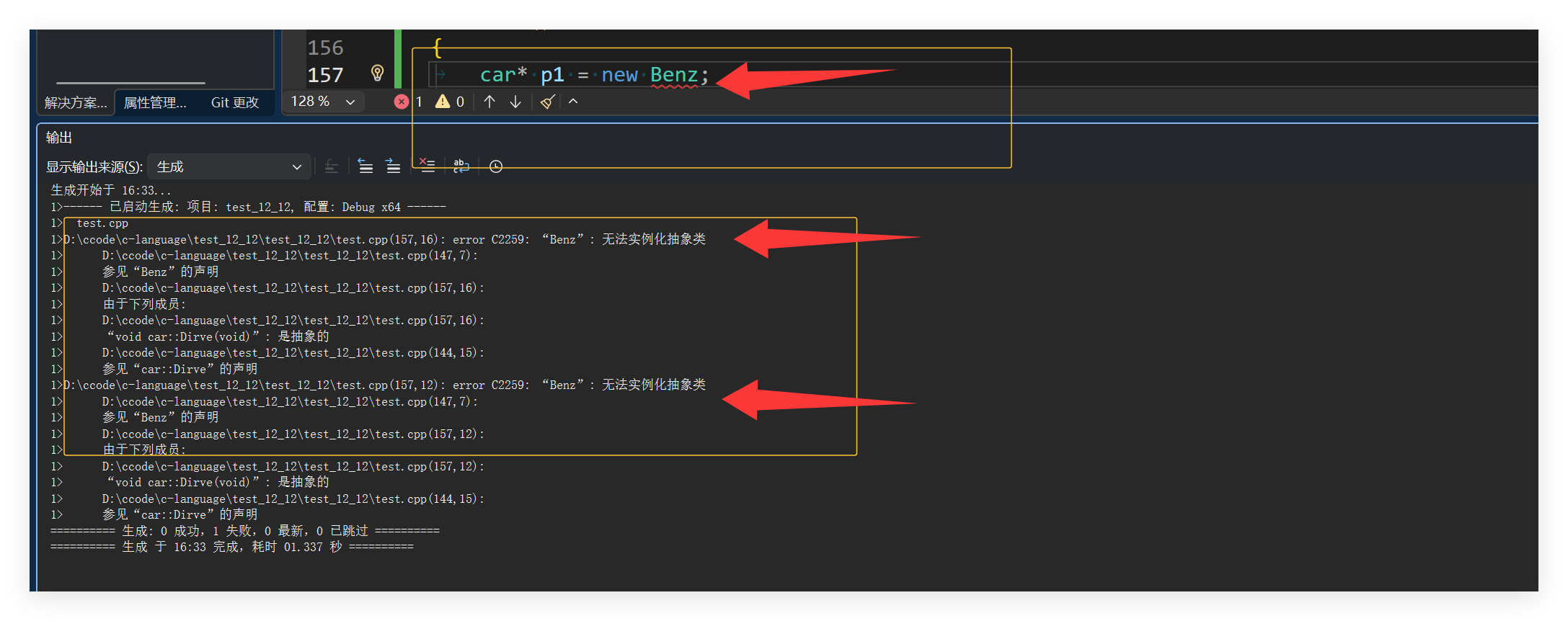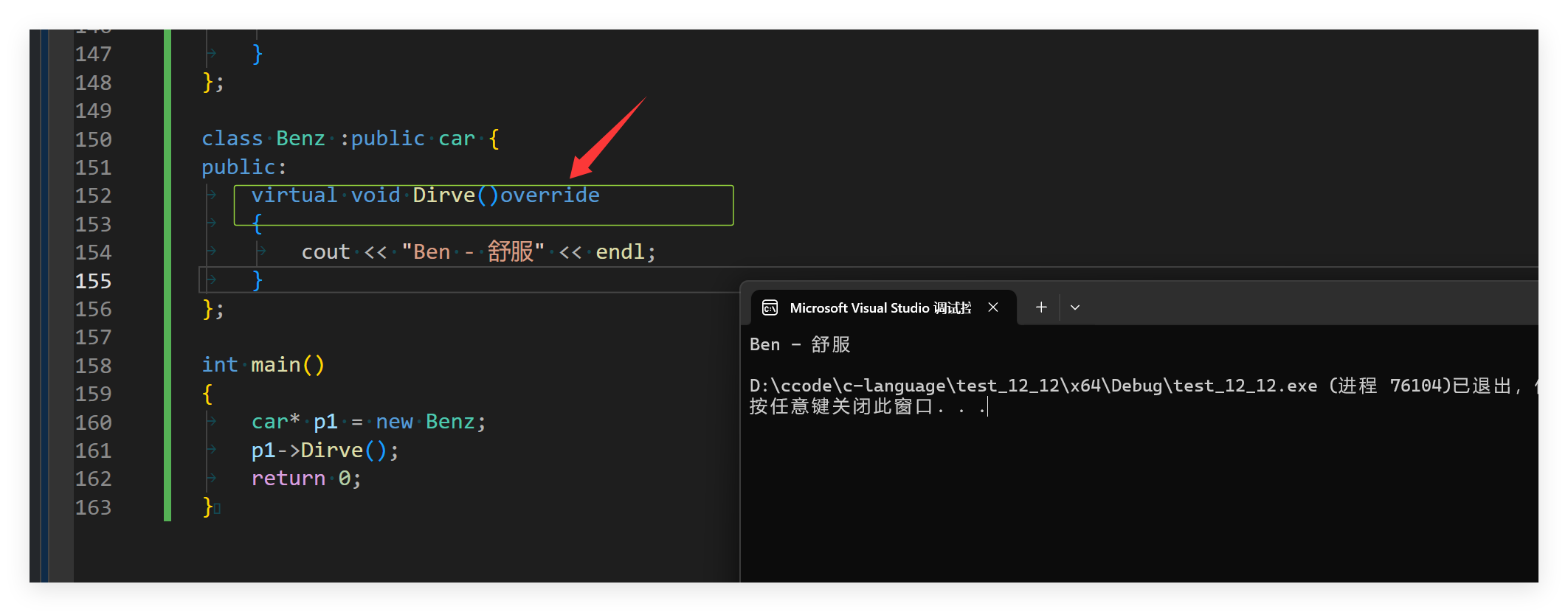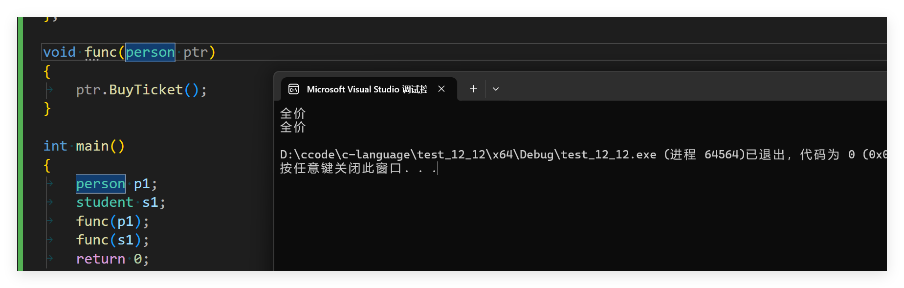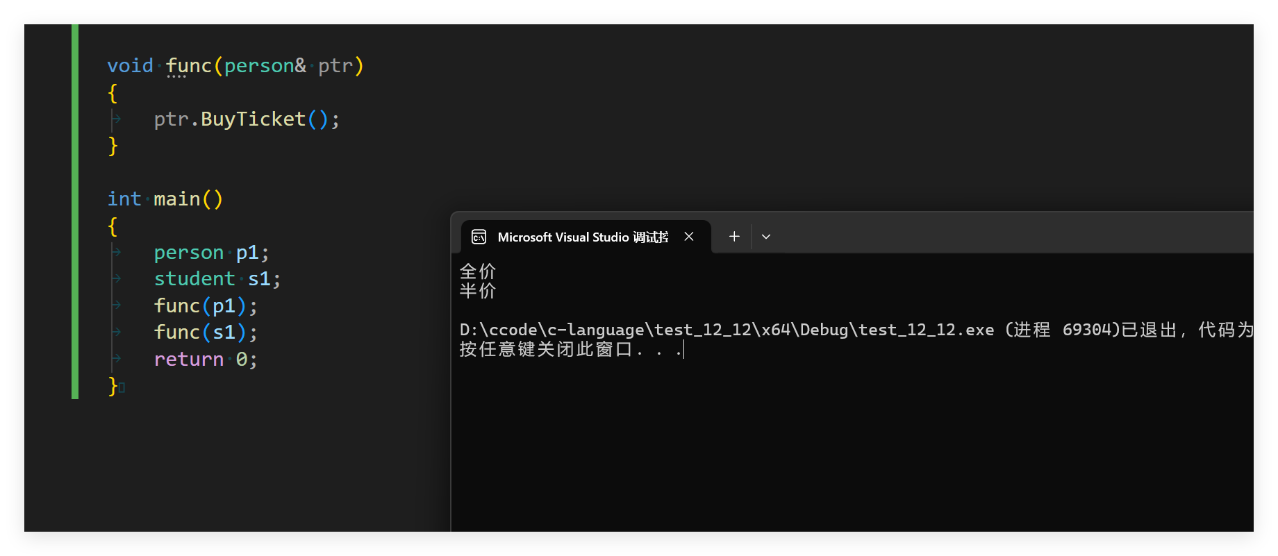 在这段程序中,我们有两个类,一个学生类,继承了人这一类。在买票的时,学生买票是半价。具体实现:定义两个虚函数,注意这两个满足重写的要求,同时在func函数中也满足了动态多态的要求,同时注意是父类的引用(基类)。