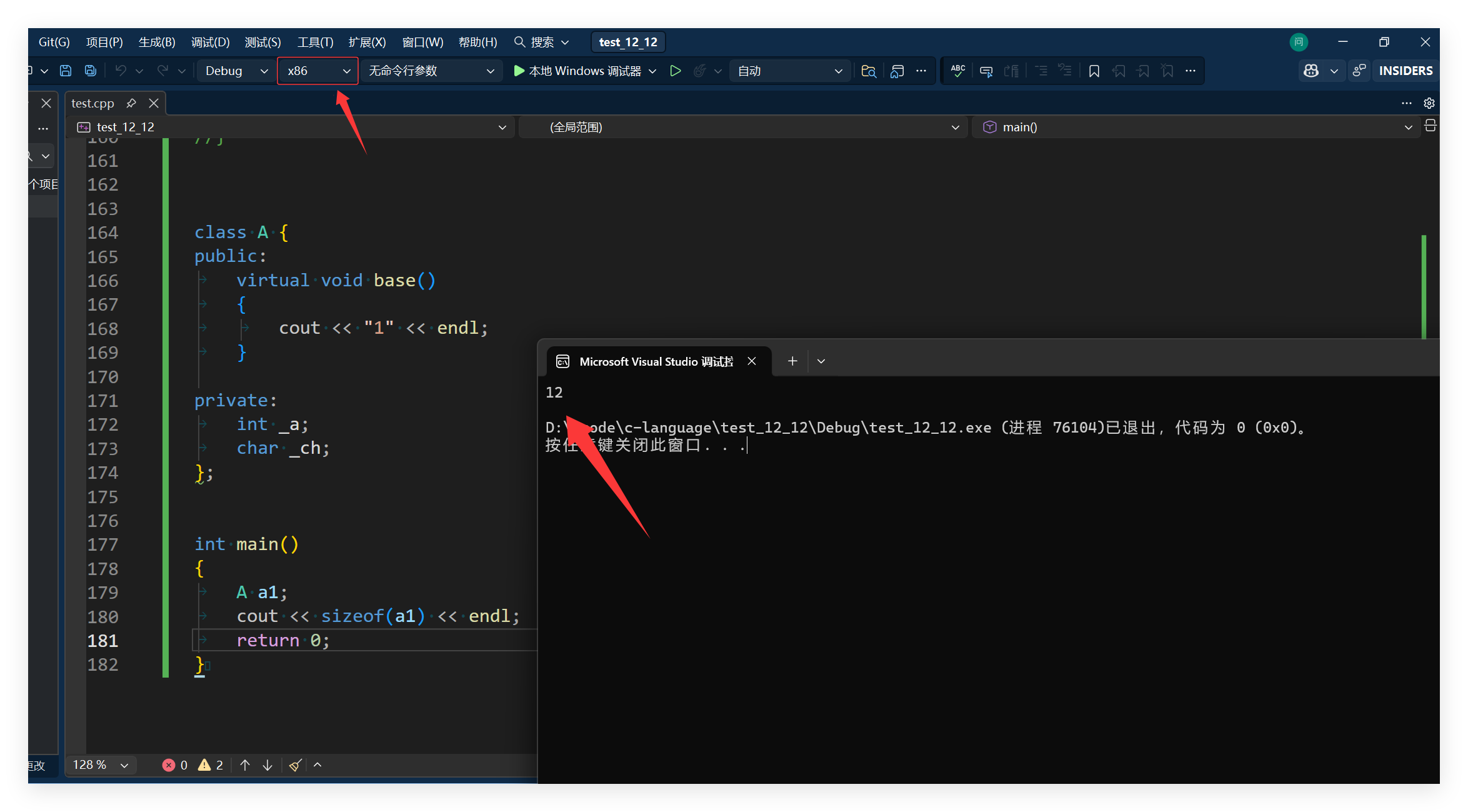 // 大小:vptr(4) + p(4) + c(1) = 9,对齐到4的倍数 → 12字节