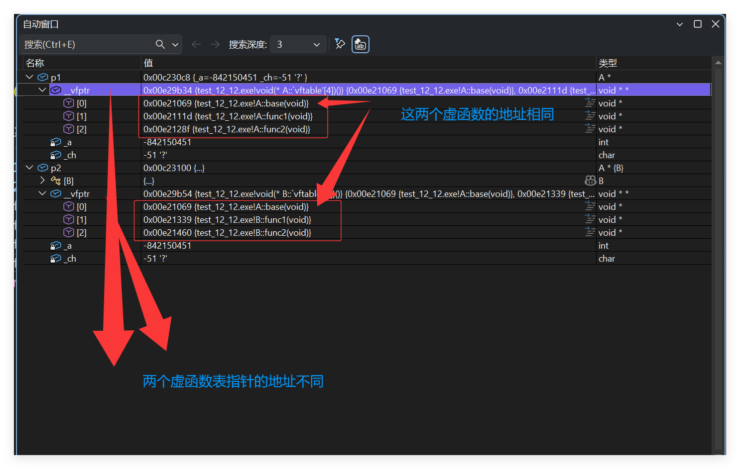 我们再通过监视子类和父类的虚函数表指针,发现很多东西:虚函数表指针所存贮的地址不同,是两个函数地址数组,但是子类没写的虚函数的地址是一致的,符合继承。重写的函数则不是一致的。这里可能是bug,我也不知道为啥不是虚函数的func2会在子类B的虚函数中。