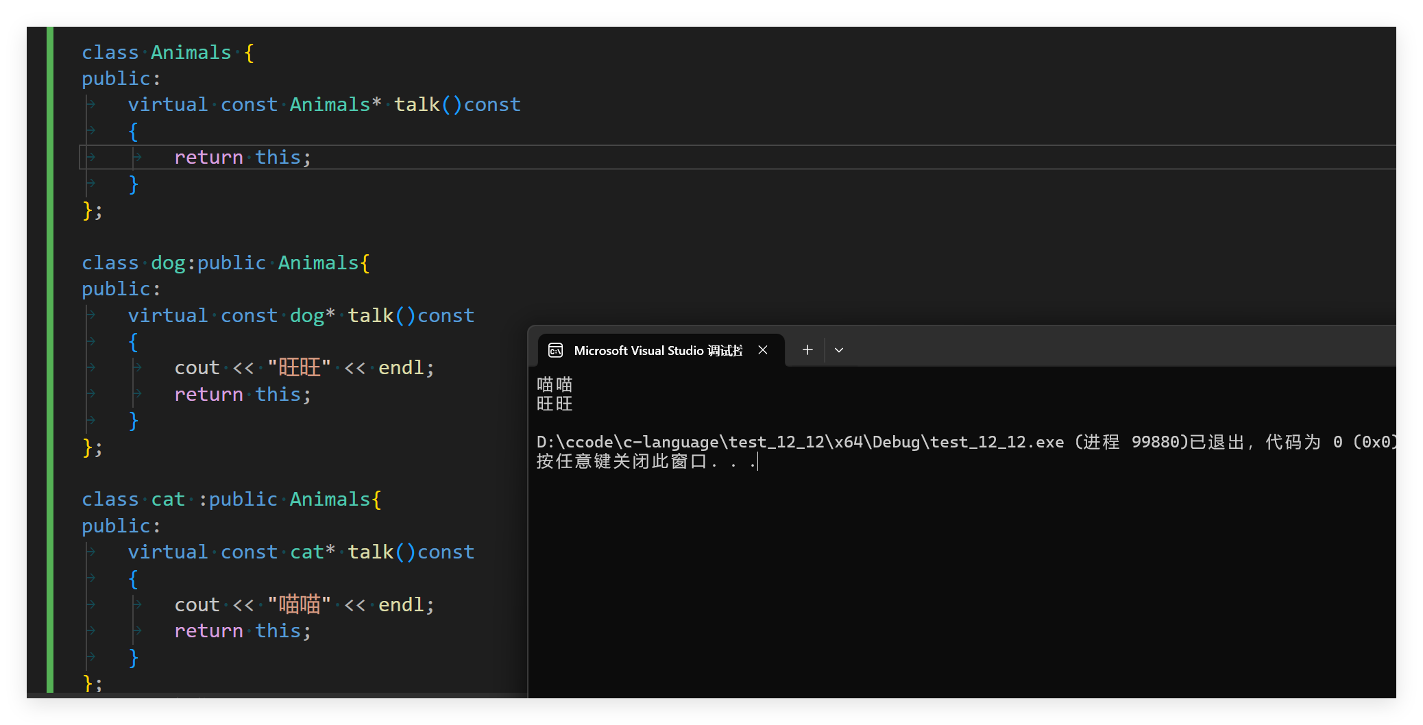 我们再看第二个程序。定义了两个类,一个是父类A,他有两个函数,一个是打印A和val的值,第二个则是利用this指针调用func函数。另一个则是继承A类的子类B,他的func函数与父类构成了重写。那么结果是什么呢?看起来构成了动态多态,结果似乎是B->0。