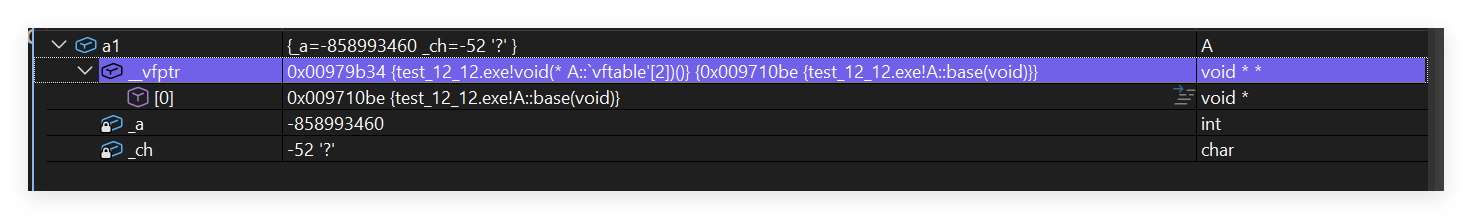 它指向一个数组,数组中存储了虚函数的地址,这个数组是函数指针的数组。让后我们定义了一个指针指向这个数组。我们可以看到这个vfptr中有一个虚函数是void base这个虚函数。通过虚函数表我们可以快速查询调用函数。