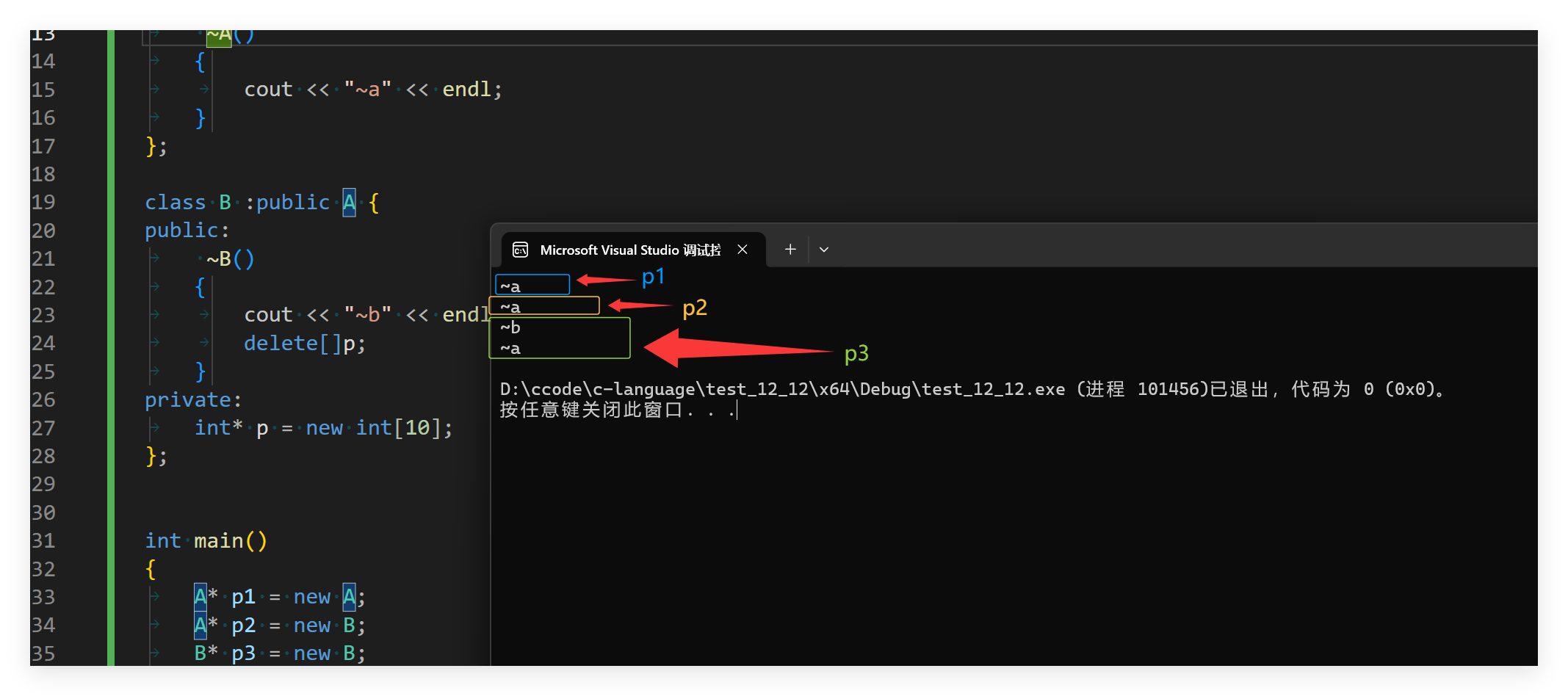 我们可以看到在调用函数的时候p2不能正确调用函数,这是他不是虚函数,他的对象是A,调用了A的析构函数,而需要调用B来完成内存管理。无法多态,正确管理内存和new出来的p变量,导致内存泄漏。