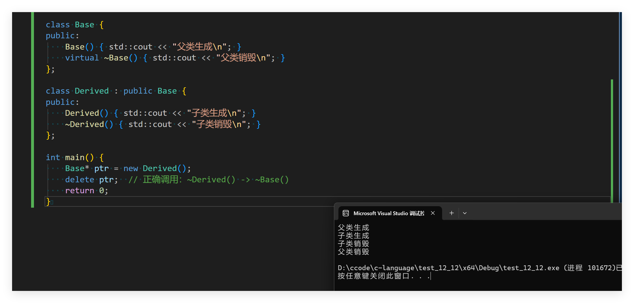 - 即使不写virtual关键字,派生类析构函数也会自动成为虚函数(如果基类析构函数是虚的)。