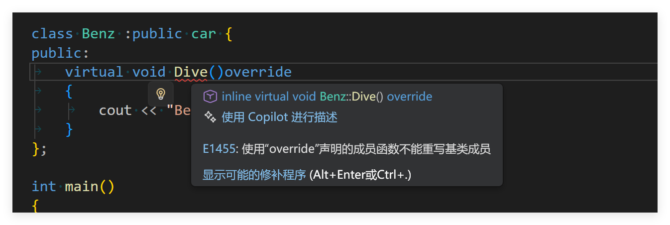 上面的代码故意写错了函数的名字,导致无法构成重写。