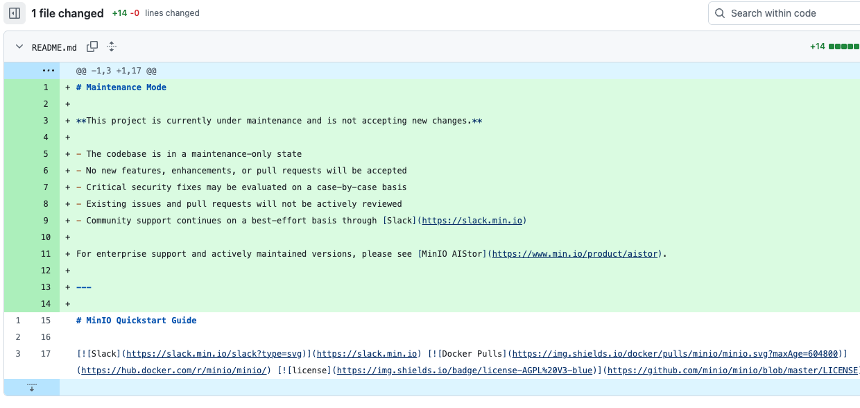 前天,minio[1] 修改了一条说明文件,大致内容如下: