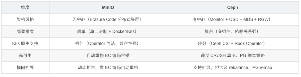 Ceph主要为大型企业分布式架构进行设计,它和minio的主要区别如下表所示[5]: