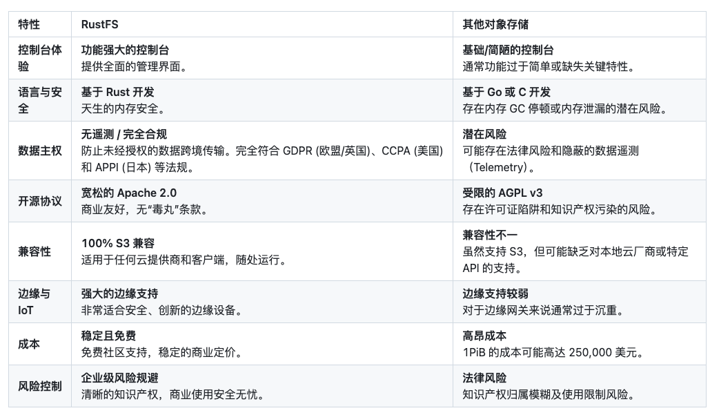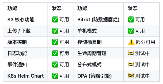 - 个人级/小型团队:可尝试 Garage 和 RustFS,前者趋于稳定,后者仍在高频迭代