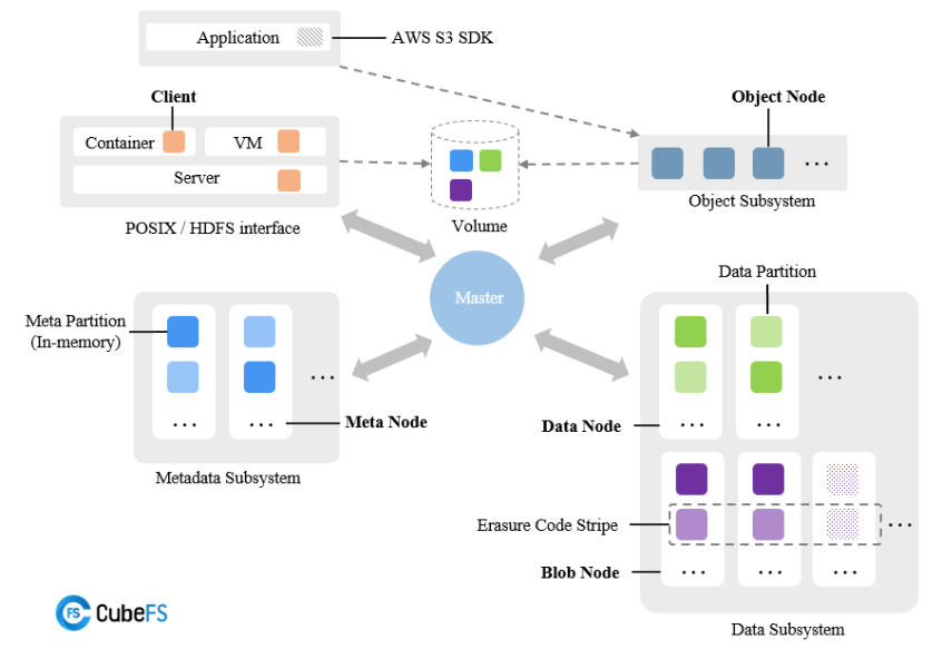 CubeFS[8] 是一套云原生分布式文件和对象存储系统,它的特点是包含一套完整的存储生态,实现数据库、搜索系统和 AI/ML 应用的存储/计算架构分离。