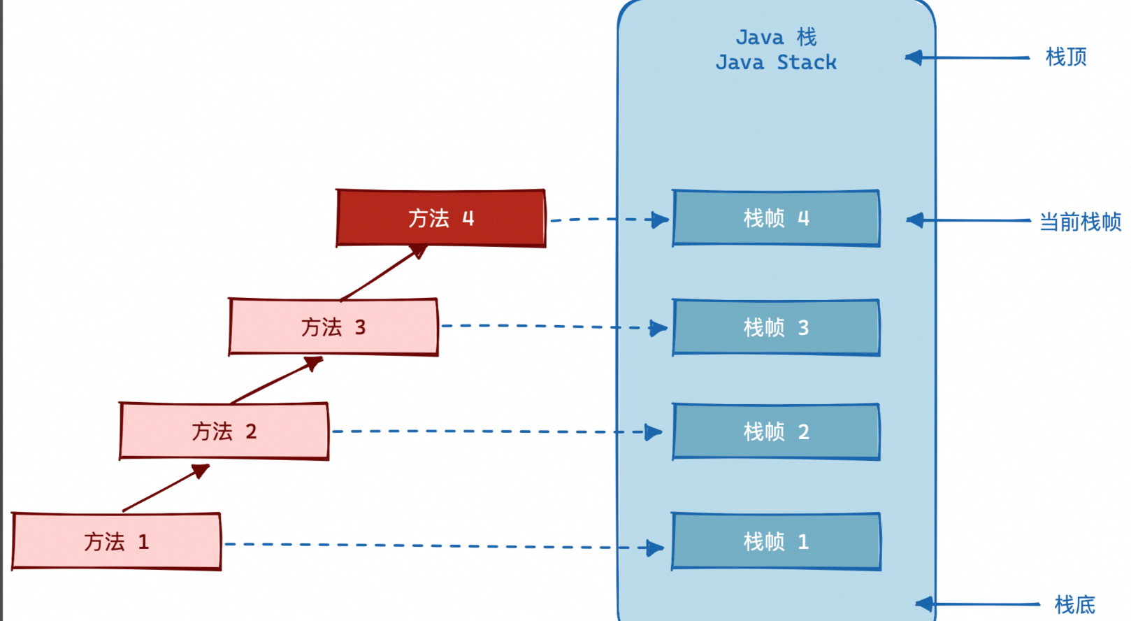 每个方法调用都会在 Java 虚拟机栈(JVM Stack) 中创建一个栈帧: