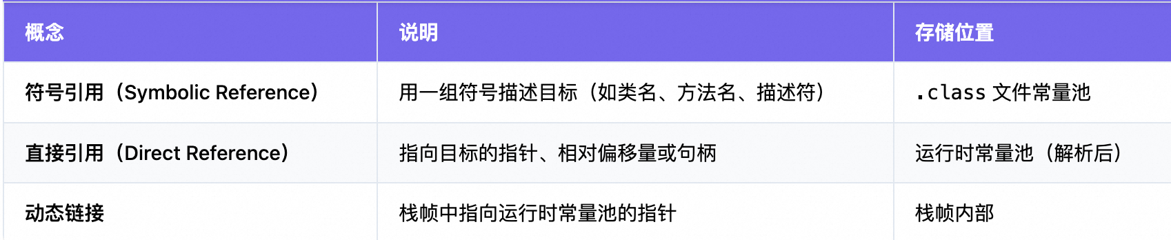 符号引用(class 文件) → 解析 → 直接引用(运行时常量池) ← 动态链接(栈帧)