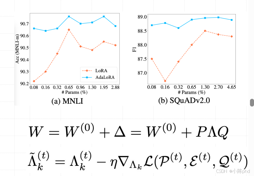 AdaLoRA(Adaptive LoRA)是对经典 LoRA 的自适应改进版,由清华大学 & 字节跳动团队 2023 年提出,核心解决了传统 LoRA"固定低秩维度(r)对所有层 / 任务均一化" 的问题 ------ 通过动态调整不同层、不同 token 的 LoRA 秩分配,在保持极低参数量的同时,进一步提升微调效果,尤其适配复杂任务(如长文本生成、多模态、复杂对话)。AdaLoRA 是 LoRA 的 "智能升级版"------ 通过分层自适应秩分配 + 稀疏更新,在保持 LoRA 参数高效、无推理开销的核心优势下,进一步提升复杂任务的微调效果。相比传统 LoRA,它更适配大模型、复杂任务,但实现复杂度略高(需自定义秩分配逻辑);相比 Prefix/Prompt Tuning,它仍保留 "无推理延迟、显存占用低" 的优势,是工业界微调大模型的下一代优选方案。