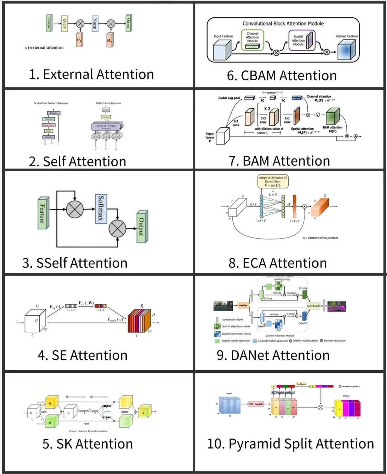 | 空间自注意力 (SSelf Attention) | 结合空间维度与通道维度的自注意力 | CNN特征增强 | 特征图动态优化 |