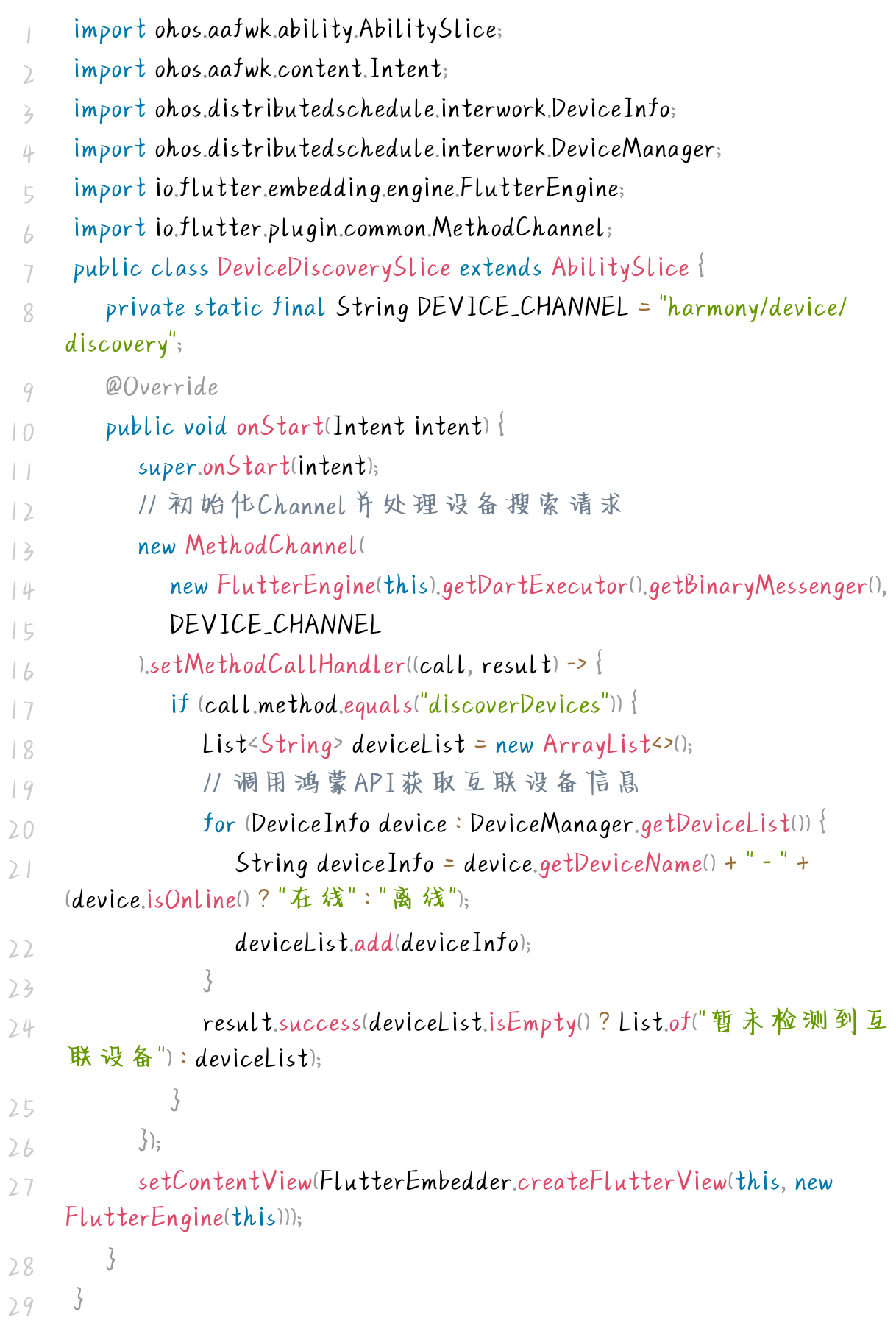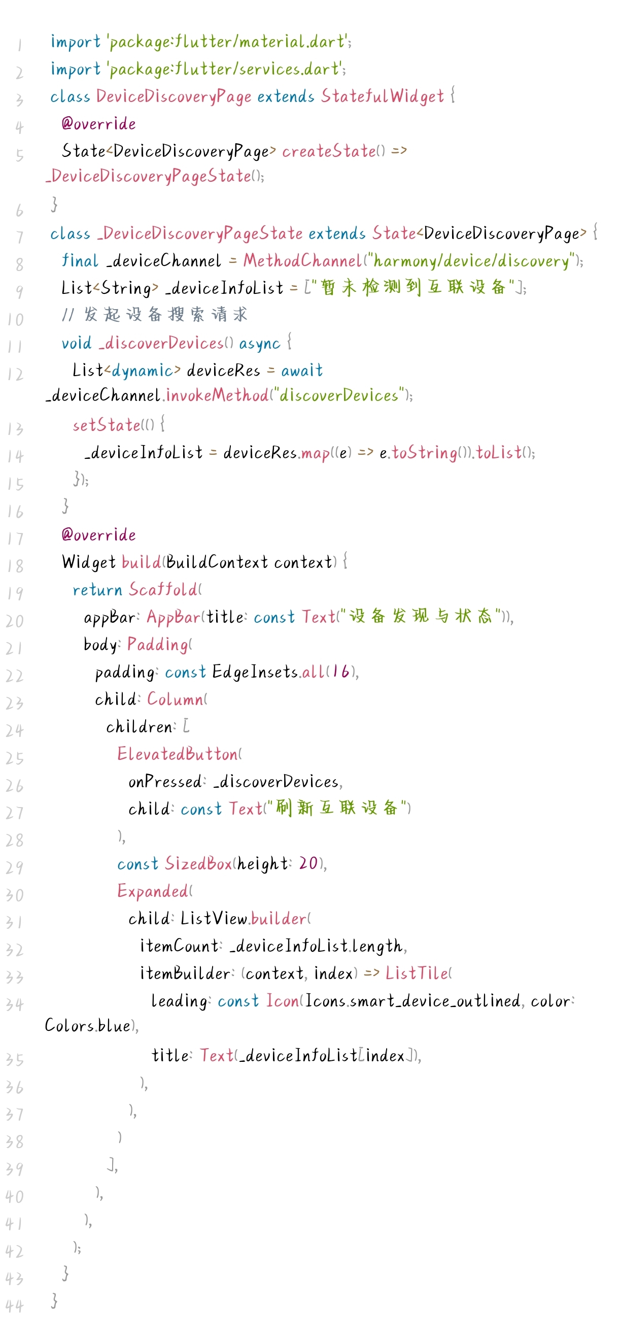 - 职责划分:Flutter端专注于交互界面搭建与用户操作响应,如设备列表展示、数据输入、功能触发等;鸿蒙原生端负责处理分布式底层逻辑,包括设备搜索、数据传输、硬件能力调用等核心操作,降低Flutter端开发复杂度。